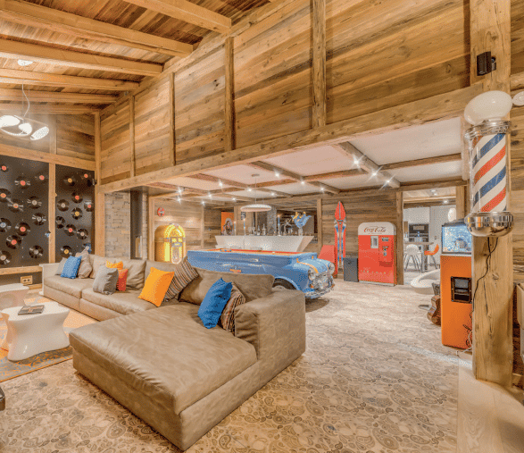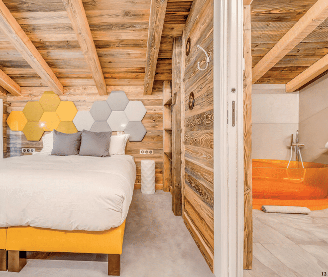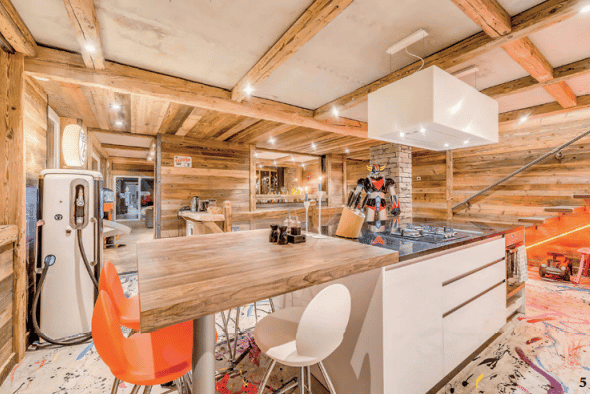 et les USA, avec beaucoup de couleurs et un côté fun », explique Guerlain Chicherit. Les 430 m2 se répartissent sur trois étages ainsi qu’une mezzanine, tous truffés de surprises et de petits clins d’œil ornementaux, soigneusement concoctés par l’imaginatif propriétaire. À l’intérieur, la musique s’affole dans le Rock n’ Love. Son design retro-contemporain et haut en couleurs fait voyager sur la Route 66, de l’époque des yéyés jusqu’au son des Doors. La collection de guitares d’exception signées d’illustres rockers fait de l’œil à ceux qui ont envie de tenter un riff sur un modèle. Et pour ceux qui ont envie de danser, il suffit de pousser les meubles et de sélectionner sur le véritable jukebox Wurlitzer l’un des 100 albums. Ce chalet offre un espace de vie spacieux, ouvert et unique avec de nombreux « jouets » pour adultes où trônent de confortables canapés et fauteuils. Plus loin, le coin repas et un bar, idéal pour se détendre après une dure journée sur les pistes de ski. Juste à côté du bar, une table de billard personnalisée, unique en son genre, construite à partir du corps d’une véritable Mini Cooper vintage. Ainsi, on joue au billard sur une Mini, au son du jukebox Wurlitzer et de son ampli Marshall. Un côté rock très seventies qui s’associe à merveille au luxe soigné et distingué des matériaux nobles sélectionnés pour la construction. Un univers résolument PopArt aux couleurs acidulées poussé à l’extrême.