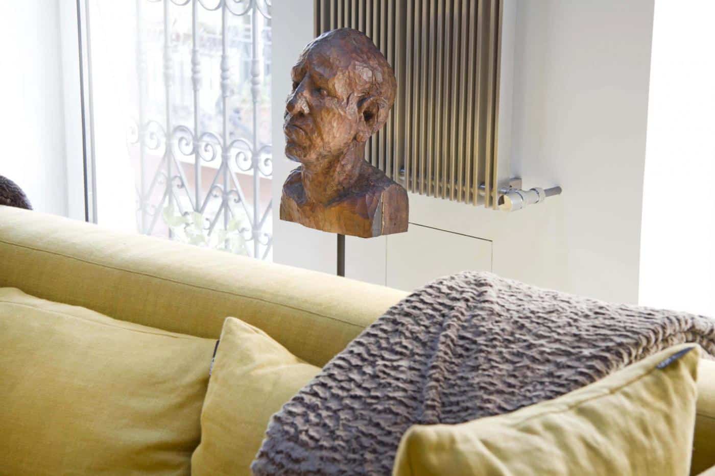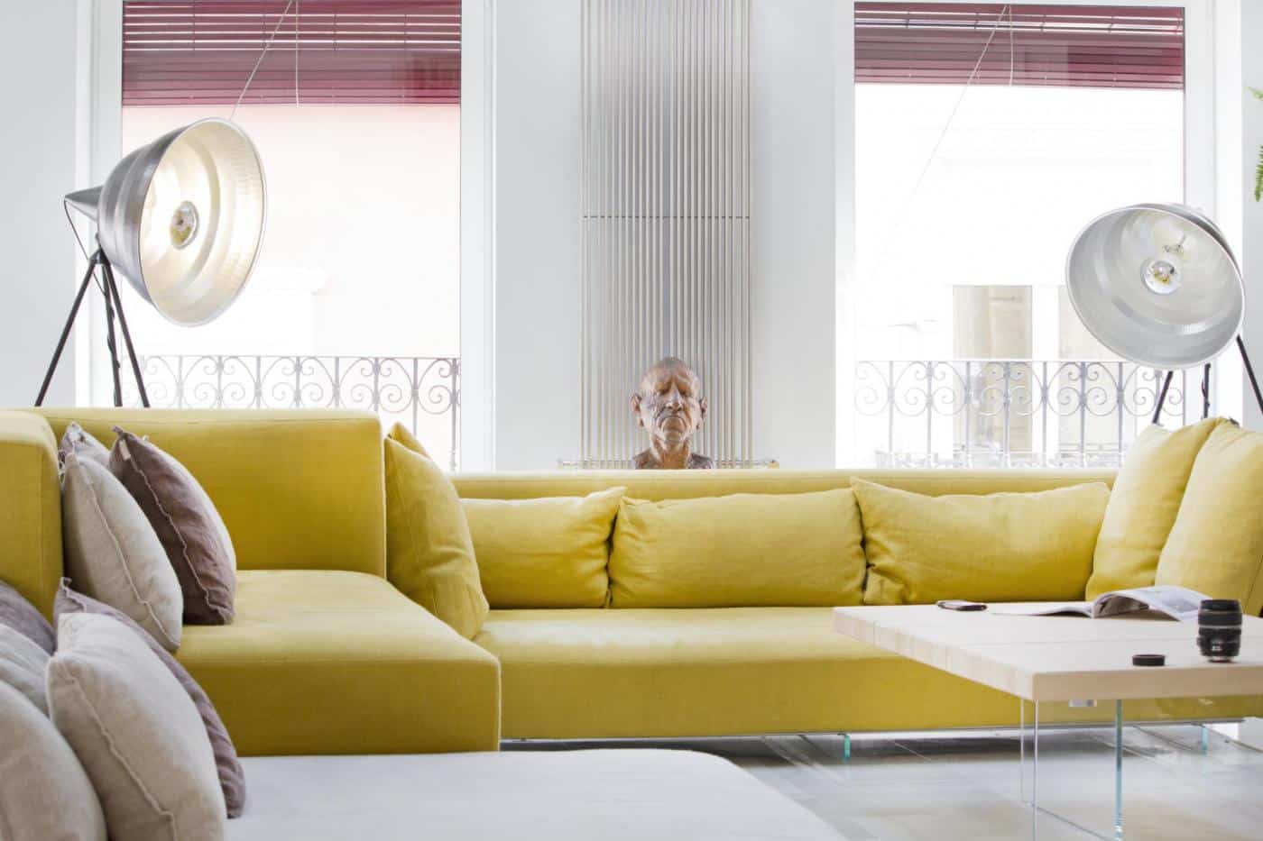 Ainsi, dans le vaste espace ouvert dédié à la musique et à la convivialité, le blanc est la couleur dominante, donnant un sentiment de paix et d’harmonie à l’appartement. Les murs en pierre d’origine mais aussi la charpente en bois, repeinte en blanc, ont été conservés, ce qui donne un certain cachet à la pièce. Outre la couleur choisie et l’apport de lumière naturelle, la grande hauteur sous plafond renforce encore davantage l’impression d’espace. Au sol, un parquet blanc vitrifié qui capte la lumière a été posé, irradiant la pièce d’un délicat éclat, et faisant joliment écho au bois de la charpente. Cette pièce à vivre qui accueille les instruments de musique des propriétaires, un magnifique piano à queue et une collection de violons, méritait un ameublement particulier, capable de mettre en valeur le volume et la luminosité. Ainsi, pour contraster avec la couleur dominante, le mobilier fait la part belle aux nuances colorées. L’utilisation judicieuse de touches de couleurs permet de rehausser l’espace dans les moindres détails. C’est le canapé Air de Lago qui a été choisi, non seulement pour son concept révolutionnaire mais aussi pour la large variété de teintes proposée, ici un jaune éclatant. En effet, Ce canapé unique, qui se décompose et se reconfigure, peut se transformer en trois fauteuils ou en deux canapés, en fonction de la manière dont sont assemblés les cadres, les assises, les dossiers et accoudoirs.