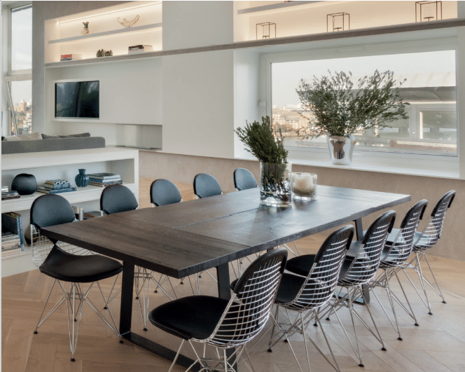 L’espace généreux de l’étage supérieur se caractérise par de subtils changements de niveau du sol, créant un paysage intérieur qui définit des zones pour se reposer, manger, cuisiner et travailler, sans avoir besoin de murs de séparation. Ce nouvel aménagement de l’espace à vivre offre désormais des vues panoramiques sur la rivière, même assis dans le canapé ou autour de la table à manger. Il a également permis un accès de plain-pied à la terrasse. Ce canapé surmesure éclairé par le dessous mais aussi la cuisine sont les éléments clés de la décoration imaginée par l’architecte d’intérieur Elizabeth Bowman, qui a ainsi réussi à définir le paysage intérieur de l’appartement, soulignant l’échelle spectaculaire et la cohérence visuelle de l’espace. « Surplombant la Tamise, l’appartement a été reconfiguré par les architectes pour offrir une vaste surface habitable sur deux étages : les chambres au niveau inférieur et l’espace de vie au-dessus. La plupart des meubles ont ainsi été faits sur mesure, notamment le canapé long de plus de 5 mètres », indique Elizabeth Bowman. Le client souhaitait que le mobilier reflète la conception architecturale, mais qu’il apporte une certaine douceur. Ainsi, le design moderne du mobilier s’associe aux tonalités choisies : gris pour le canapé et le pouf bleu pétrole pour les deux fauteuils et les coussins, en harmonie avec les murs blancs et le parquet en chevron d’une tonalité claire. L’aménagement intérieur s’articule également autour de l’îlot blanc de la cuisine, en Hi-Macs®, et de son immense hotte suspendue en acier inoxydable. Long de presque 5 mètres, cet imposant îlot sublime l’absolue cohérence de l’espace. Il semble être fait d’une seule pièce, effet rendu possible par l’assemblage sans joints apparents, caractéristique du Solid Surface. Le double évier également en Hi-Macs® est intégré au plan de travail de manière totalement homogène, garantissant un environnement sans bactéries ni saletés dans la durée, un prérequis indispensable à chaque zone de préparation culinaire. Le plan de travail se prolonge sur les côtés pour en renforcer l’impact visuel. Enfin, la spectaculaire table en bois sombre de 3 mètres de long, également fabriquée sur-mesure, peut accueillir 12 convives.