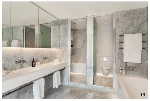 Au niveau inférieur, une spectaculaire suite parentale, dont le lit fait face à un large bow-window qui court du sol au plafond, permettant ainsi de profiter du panorama aux airs de peintures de Canaletto. Dans le coin, un canapé circulaire rotatif conçu par Citterio. Sa rotation permet soit de contempler la vue panoramique, soit l’intérieur de la chambre. « Faisant office de tête de lit, tout un pan de mur est tapissé de faux suède gris. Le lit et les tables de chevet ont été réalisés sur-mesure ». Au sol, un parquet en chevrons, d’une tonalité claire, contraste avec le douillet couvre-lit d’un vibrant chocolat à la texture épaisse et soyeuse et les plaid et coussin d’un orange brûlé. La salle de bains attenante comprend un meuble vasque sur toute la longueur, dans lequel deux lavabos de la collection Not Only White « Blend » sont encastrés, le tout conçu en Hi-Macs®. Son toucher doux et chaleureux en fait un matériau parfait pour un usage dans les pièces d’eau. Le siège monolithique dans la douche est également en Hi-Macs®, dont la surface non poreuse le met à l’abri des salissures et moisissures, et ce pour longtemps. Enfin, une baignoire HiMacs® sur-mesure complète cet environnement très apaisant. Deux autres chambres, accessibles par l’entrée de l’appartement, complètent la disposition rationnelle de l’étage inférieur.